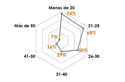 Como se muestra en la gráfica anterior, la mayor proporción de usuarios de videojuegos se ubica entre los 20 y 30 años. No obstante, existe una importante razón de usuarios en el segmento poblacional entre 31 y 40 años. Tomando en cuenta que las primeras generaciones que nacieron con consolas de videojuegos son hoy adultos contemporáneos que se ubican entre los 25 y 35 años, es probable que el margen de edad en el uso de dispositivos de entretenimiento pueda mantener un incremento continuo a la par del envejecimiento de esta generación de gamers nativos.