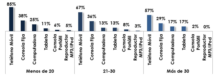 Por su parte, los usuarios mayores a 30 años son los que utilizan tabletas como plataforma de juego en mayor proporción que los segmentos de edad anteriores, en razón de que su poder adquisitivo es mayor, aunado a que probablemente estos equipos son utilizados como herramientas de trabajo.